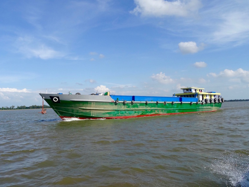 La plupart des voyageurs qui souhaitent rejoindre Chau Doc dans la région du Delta du Mékong depuis Phnom Penh le font (au moins partiellement) en bateau sur le Mékong. Mais j’avais lu sur divers blogs que ce trajet n’était pas le plus beau, et j’avais rencontré une voyageuse qui ayant effectué ce trajet en sens inverse en bus, plus court et moins cher. J’ai donc cherché dans toutes les agences de bus de la ville la compagnie proposant ce trajet, mais je ne l’ai jamais trouvée. J’ai finalement acheté un billet combiné qui commence en bus jusqu’à la frontière, et se termine en bateau. Je confirme qu’à part l’amusement du poste frontière sous les cocotiers et du second poste frontière flottant, le trajet sur cette portion du Mékong n’est pas vilain, mais il n’a pas non plus grand intérêt. Surtout si on considère les 3 heures d’attente au poste frontière car on a payé pour un slow boat et non un speed boat…