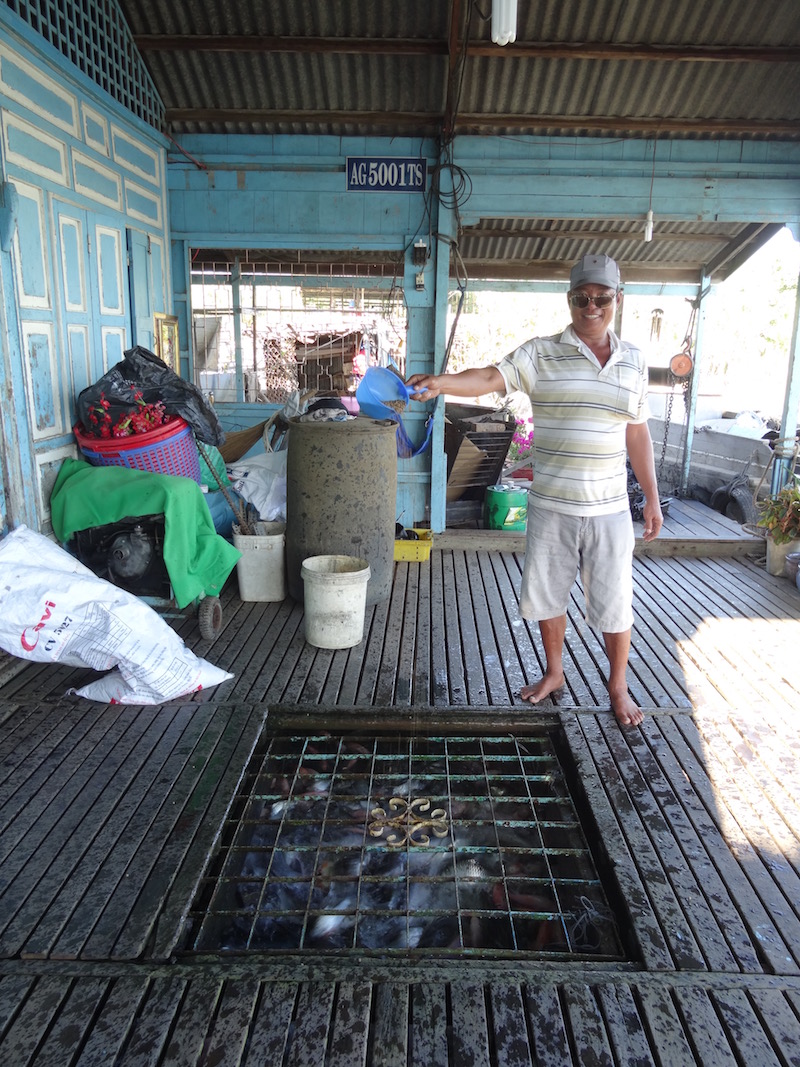 Nous nous sommes ensuite dirigés vers la ferme d’élevage de poissons. Sous les maisons flottantes, les habitants construisent de très grandes cages, de la même taille que la maison dans laquelle ils élèvent des poissons que l’on retrouve ensuite sur les étals des marchés. Ça grouille en dessous c’est assez étonnant, et pas besoin de pêcher, il suffit de se servir !